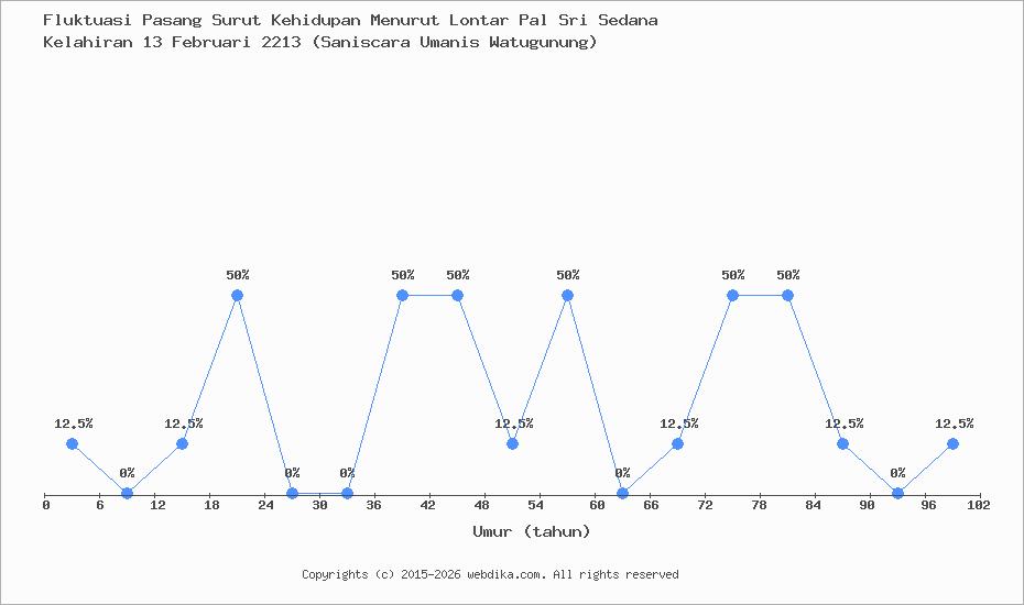 Menurut pustaka leluhur Pal Sri Sedana, Perubahan nasib, rejeki, dan kebahagiaan hidup seseorang terjadi setiap 6 tahun. Anda yang lahir pada hari Sabtu, 13 Februari 2213 (Saniscara Umanis Watugunung), pasang surut perjalanan kehidupan Anda diprediksi sampai umur 84 tahun. Apabila umur Anda melebihi 84 tahun, maka tahun ke 85-90 dan selanjutnya, fluktuasi kehidupan Anda kembali lagi ke awal, yaitu umur 0-6 tahun, begitu seterusnya.
