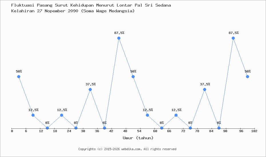Menurut pustaka leluhur Pal Sri Sedana, Perubahan nasib, rejeki, dan kebahagiaan hidup seseorang terjadi setiap 6 tahun. Anda yang lahir pada hari Senin, 27 Nopember 2090 (Soma Wage Medangsia), pasang surut perjalanan kehidupan Anda diprediksi sampai umur 48 tahun. Apabila umur Anda melebihi 48 tahun, maka tahun ke 49-54 dan selanjutnya, fluktuasi kehidupan Anda kembali lagi ke awal, yaitu umur 0-6 tahun, begitu seterusnya.