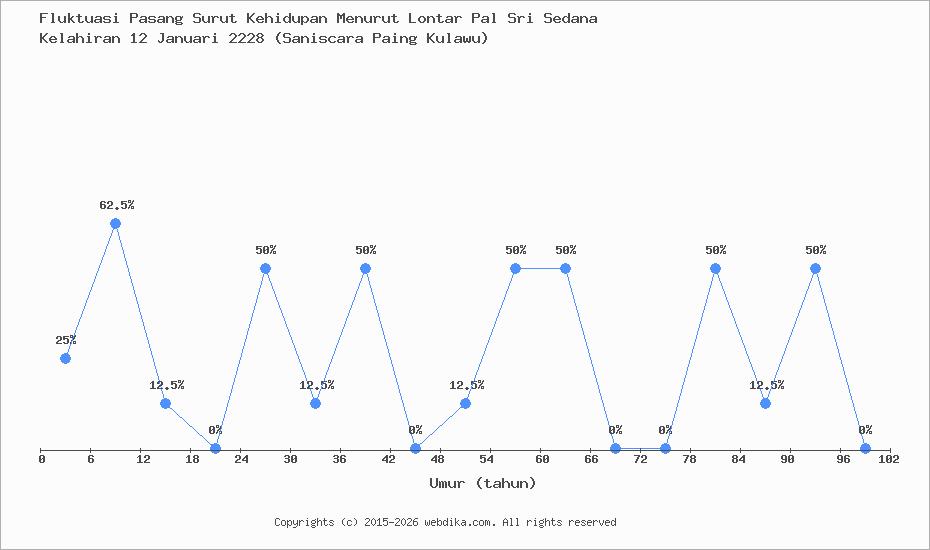 Menurut pustaka leluhur Pal Sri Sedana, Perubahan nasib, rejeki, dan kebahagiaan hidup seseorang terjadi setiap 6 tahun. Anda yang lahir pada hari Sabtu, 12 Januari 2228 (Saniscara Paing Kulawu), pasang surut perjalanan kehidupan Anda diprediksi sampai umur 108 tahun.