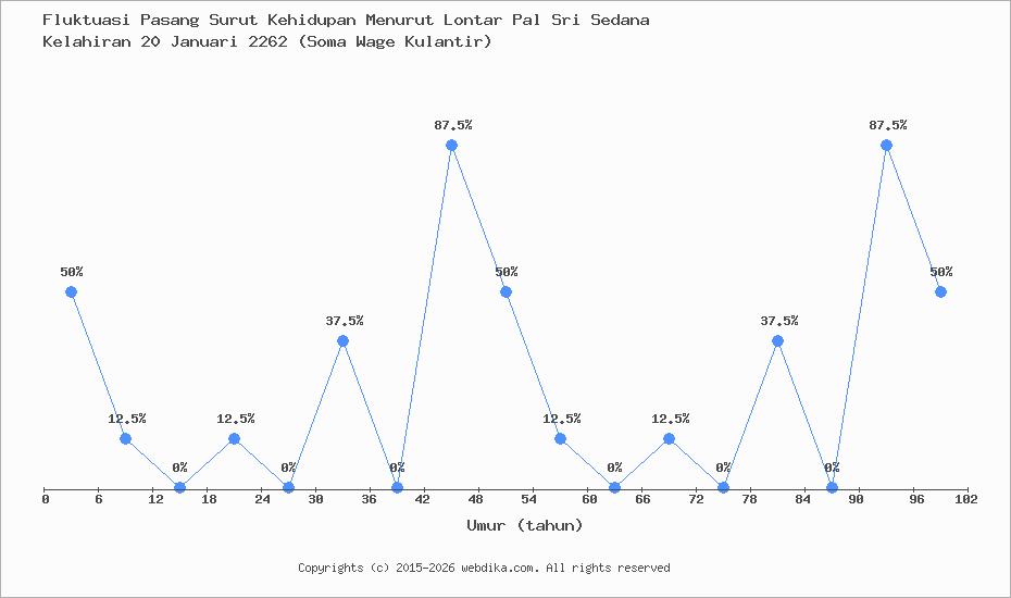 Menurut pustaka leluhur Pal Sri Sedana, Perubahan nasib, rejeki, dan kebahagiaan hidup seseorang terjadi setiap 6 tahun. Anda yang lahir pada hari Senin, 20 Januari 2262 (Soma Wage Kulantir), pasang surut perjalanan kehidupan Anda diprediksi sampai umur 48 tahun. Apabila umur Anda melebihi 48 tahun, maka tahun ke 49-54 dan selanjutnya, fluktuasi kehidupan Anda kembali lagi ke awal, yaitu umur 0-6 tahun, begitu seterusnya.