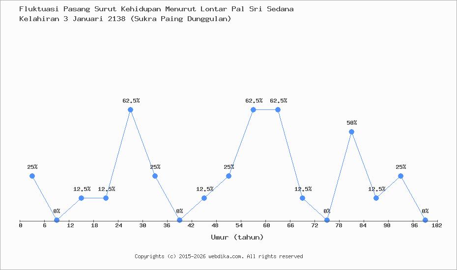 Menurut pustaka leluhur Pal Sri Sedana, Perubahan nasib, rejeki, dan kebahagiaan hidup seseorang terjadi setiap 6 tahun. Anda yang lahir pada hari Jumat, 3 Januari 2138 (Sukra Paing Dunggulan), pasang surut perjalanan kehidupan Anda diprediksi sampai umur 90 tahun. Apabila umur Anda melebihi 90 tahun, maka tahun ke 91-96 dan selanjutnya, fluktuasi kehidupan Anda kembali lagi ke awal, yaitu umur 0-6 tahun, begitu seterusnya.