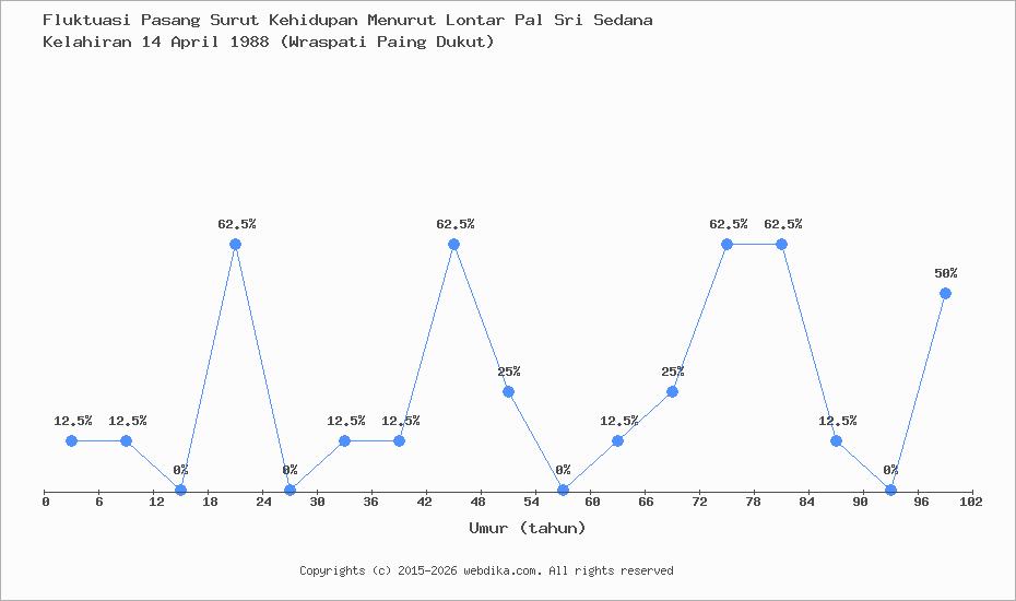 Menurut pustaka leluhur Pal Sri Sedana, Perubahan nasib, rejeki, dan kebahagiaan hidup seseorang terjadi setiap 6 tahun. Anda yang lahir pada hari Kamis, 14 April 1988 (Wraspati Paing Dukut), pasang surut perjalanan kehidupan Anda diprediksi sampai umur 102 tahun. Apabila umur Anda melebihi 102 tahun, maka tahun ke 103-108 dan selanjutnya, fluktuasi kehidupan Anda kembali lagi ke awal, yaitu umur 0-6 tahun, begitu seterusnya.