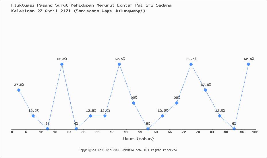 Menurut pustaka leluhur Pal Sri Sedana, Perubahan nasib, rejeki, dan kebahagiaan hidup seseorang terjadi setiap 6 tahun. Anda yang lahir pada hari Sabtu, 27 April 2171 (Saniscara Wage Julungwangi), pasang surut perjalanan kehidupan Anda diprediksi sampai umur 78 tahun. Apabila umur Anda melebihi 78 tahun, maka tahun ke 79-84 dan selanjutnya, fluktuasi kehidupan Anda kembali lagi ke awal, yaitu umur 0-6 tahun, begitu seterusnya.