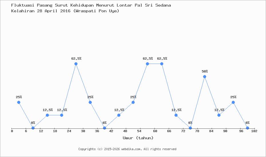 Menurut pustaka leluhur Pal Sri Sedana, Perubahan nasib, rejeki, dan kebahagiaan hidup seseorang terjadi setiap 6 tahun. Anda yang lahir pada hari Kamis, 28 April 2016 (Wraspati Pon Uye), pasang surut perjalanan kehidupan Anda diprediksi sampai umur 90 tahun. Apabila umur Anda melebihi 90 tahun, maka tahun ke 91-96 dan selanjutnya, fluktuasi kehidupan Anda kembali lagi ke awal, yaitu umur 0-6 tahun, begitu seterusnya.