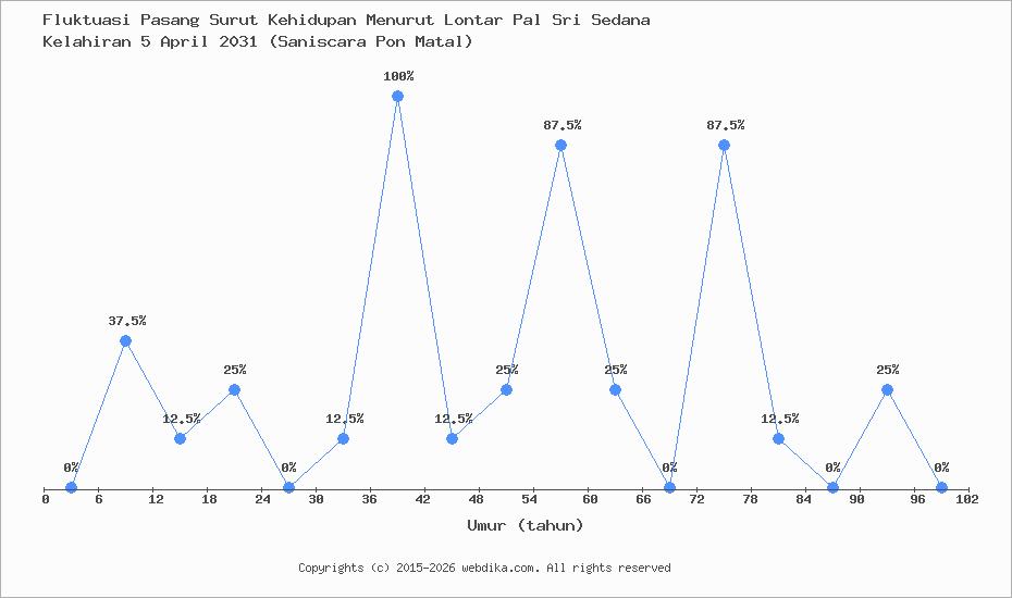 Menurut pustaka leluhur Pal Sri Sedana, Perubahan nasib, rejeki, dan kebahagiaan hidup seseorang terjadi setiap 6 tahun. Anda yang lahir pada hari Sabtu, 5 April 2031 (Saniscara Pon Matal), pasang surut perjalanan kehidupan Anda diprediksi sampai umur 96 tahun. Apabila umur Anda melebihi 96 tahun, maka tahun ke 97-102 dan selanjutnya, fluktuasi kehidupan Anda kembali lagi ke awal, yaitu umur 0-6 tahun, begitu seterusnya.