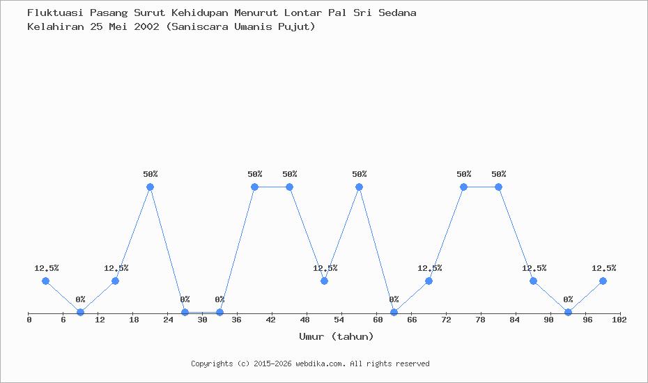 Menurut pustaka leluhur Pal Sri Sedana, Perubahan nasib, rejeki, dan kebahagiaan hidup seseorang terjadi setiap 6 tahun. Anda yang lahir pada hari Sabtu, 25 Mei 2002 (Saniscara Umanis Pujut), pasang surut perjalanan kehidupan Anda diprediksi sampai umur 84 tahun. Apabila umur Anda melebihi 84 tahun, maka tahun ke 85-90 dan selanjutnya, fluktuasi kehidupan Anda kembali lagi ke awal, yaitu umur 0-6 tahun, begitu seterusnya.