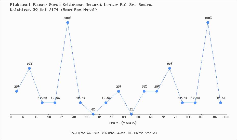 Menurut pustaka leluhur Pal Sri Sedana, Perubahan nasib, rejeki, dan kebahagiaan hidup seseorang terjadi setiap 6 tahun. Anda yang lahir pada hari Senin, 30 Mei 2174 (Soma Pon Matal), pasang surut perjalanan kehidupan Anda diprediksi sampai umur 66 tahun. Apabila umur Anda melebihi 66 tahun, maka tahun ke 67-72 dan selanjutnya, fluktuasi kehidupan Anda kembali lagi ke awal, yaitu umur 0-6 tahun, begitu seterusnya.