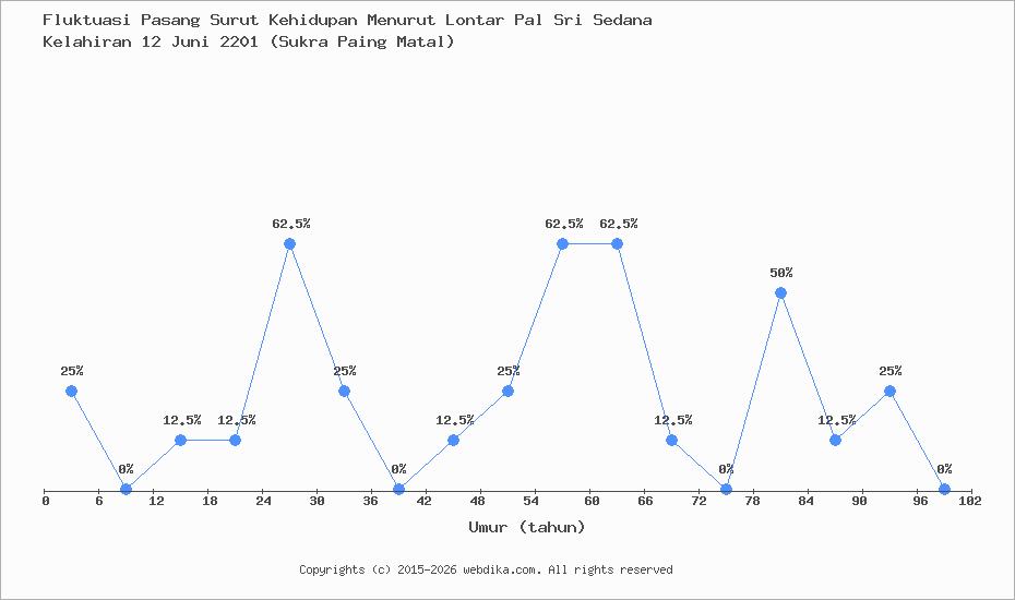 Menurut pustaka leluhur Pal Sri Sedana, Perubahan nasib, rejeki, dan kebahagiaan hidup seseorang terjadi setiap 6 tahun. Anda yang lahir pada hari Jumat, 12 Juni 2201 (Sukra Paing Matal), pasang surut perjalanan kehidupan Anda diprediksi sampai umur 90 tahun. Apabila umur Anda melebihi 90 tahun, maka tahun ke 91-96 dan selanjutnya, fluktuasi kehidupan Anda kembali lagi ke awal, yaitu umur 0-6 tahun, begitu seterusnya.