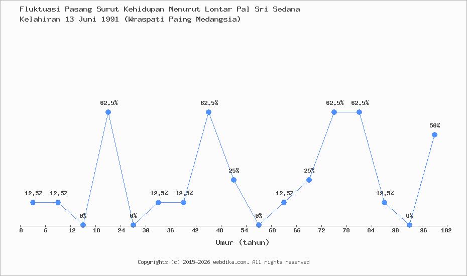 Menurut pustaka leluhur Pal Sri Sedana, Perubahan nasib, rejeki, dan kebahagiaan hidup seseorang terjadi setiap 6 tahun. Anda yang lahir pada hari Kamis, 13 Juni 1991 (Wraspati Paing Medangsia), pasang surut perjalanan kehidupan Anda diprediksi sampai umur 102 tahun. Apabila umur Anda melebihi 102 tahun, maka tahun ke 103-108 dan selanjutnya, fluktuasi kehidupan Anda kembali lagi ke awal, yaitu umur 0-6 tahun, begitu seterusnya.