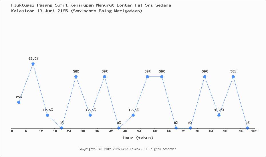 Menurut pustaka leluhur Pal Sri Sedana, Perubahan nasib, rejeki, dan kebahagiaan hidup seseorang terjadi setiap 6 tahun. Anda yang lahir pada hari Sabtu, 13 Juni 2195 (Saniscara Paing Warigadean), pasang surut perjalanan kehidupan Anda diprediksi sampai umur 108 tahun.