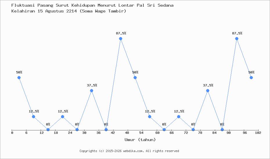 Menurut pustaka leluhur Pal Sri Sedana, Perubahan nasib, rejeki, dan kebahagiaan hidup seseorang terjadi setiap 6 tahun. Anda yang lahir pada hari Senin, 15 Agustus 2214 (Soma Wage Tambir), pasang surut perjalanan kehidupan Anda diprediksi sampai umur 48 tahun. Apabila umur Anda melebihi 48 tahun, maka tahun ke 49-54 dan selanjutnya, fluktuasi kehidupan Anda kembali lagi ke awal, yaitu umur 0-6 tahun, begitu seterusnya.