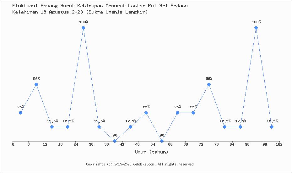 Menurut pustaka leluhur Pal Sri Sedana, Perubahan nasib, rejeki, dan kebahagiaan hidup seseorang terjadi setiap 6 tahun. Anda yang lahir pada hari Jumat, 18 Agustus 2023 (Sukra Umanis Langkir), pasang surut perjalanan kehidupan Anda diprediksi sampai umur 66 tahun. Apabila umur Anda melebihi 66 tahun, maka tahun ke 67-72 dan selanjutnya, fluktuasi kehidupan Anda kembali lagi ke awal, yaitu umur 0-6 tahun, begitu seterusnya.