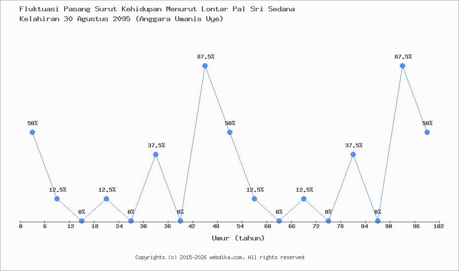 Menurut pustaka leluhur Pal Sri Sedana, Perubahan nasib, rejeki, dan kebahagiaan hidup seseorang terjadi setiap 6 tahun. Anda yang lahir pada hari Selasa, 30 Agustus 2095 (Anggara Umanis Uye), pasang surut perjalanan kehidupan Anda diprediksi sampai umur 48 tahun. Apabila umur Anda melebihi 48 tahun, maka tahun ke 49-54 dan selanjutnya, fluktuasi kehidupan Anda kembali lagi ke awal, yaitu umur 0-6 tahun, begitu seterusnya.