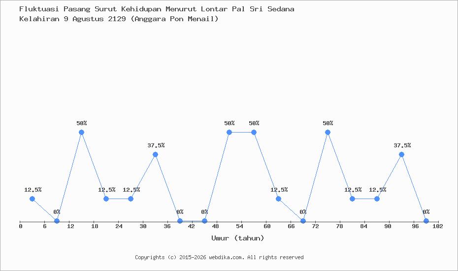 Menurut pustaka leluhur Pal Sri Sedana, Perubahan nasib, rejeki, dan kebahagiaan hidup seseorang terjadi setiap 6 tahun. Anda yang lahir pada hari Selasa, 9 Agustus 2129 (Anggara Pon Menail), pasang surut perjalanan kehidupan Anda diprediksi sampai umur 60 tahun. Apabila umur Anda melebihi 60 tahun, maka tahun ke 61-66 dan selanjutnya, fluktuasi kehidupan Anda kembali lagi ke awal, yaitu umur 0-6 tahun, begitu seterusnya.