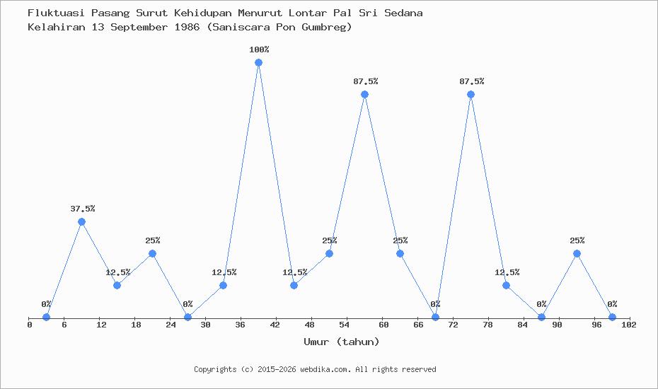 Menurut pustaka leluhur Pal Sri Sedana, Perubahan nasib, rejeki, dan kebahagiaan hidup seseorang terjadi setiap 6 tahun. Anda yang lahir pada hari Sabtu, 13 September 1986 (Saniscara Pon Gumbreg), pasang surut perjalanan kehidupan Anda diprediksi sampai umur 96 tahun. Apabila umur Anda melebihi 96 tahun, maka tahun ke 97-102 dan selanjutnya, fluktuasi kehidupan Anda kembali lagi ke awal, yaitu umur 0-6 tahun, begitu seterusnya.
