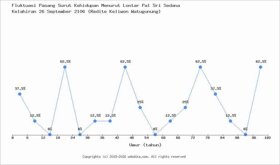 Menurut pustaka leluhur Pal Sri Sedana, Perubahan nasib, rejeki, dan kebahagiaan hidup seseorang terjadi setiap 6 tahun. Anda yang lahir pada hari Minggu, 26 September 2106 (Redite Keliwon Watugunung), pasang surut perjalanan kehidupan Anda diprediksi sampai umur 78 tahun. Apabila umur Anda melebihi 78 tahun, maka tahun ke 79-84 dan selanjutnya, fluktuasi kehidupan Anda kembali lagi ke awal, yaitu umur 0-6 tahun, begitu seterusnya.